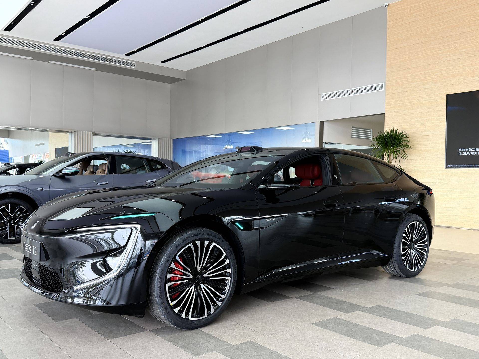 外观方面,新款阿维塔12基本保持了现款车型的轮廓设计,但通过细节优化提升了科技感与辨识度。车顶新增的华为乾崑896线激光雷达成为最大亮点,配合四激光雷达方案和5颗毫米波雷达,形成更强大的感知系统。前脸部分,增程版采用菱形网状下格栅,纯电版则配备主动进气格栅,并提供65L前备箱。车身侧面延续无后舷窗掀背设计,搭配20/21英寸轮毂、红色刹车卡钳和主动升降尾翼,运动气质显著。新车换装半隐藏式门把手,B柱增加"乾崑智驾ADS"标识,前后灯组和前翼子板处均配备"智驾小蓝灯",进一步强化智能驾驶属性。