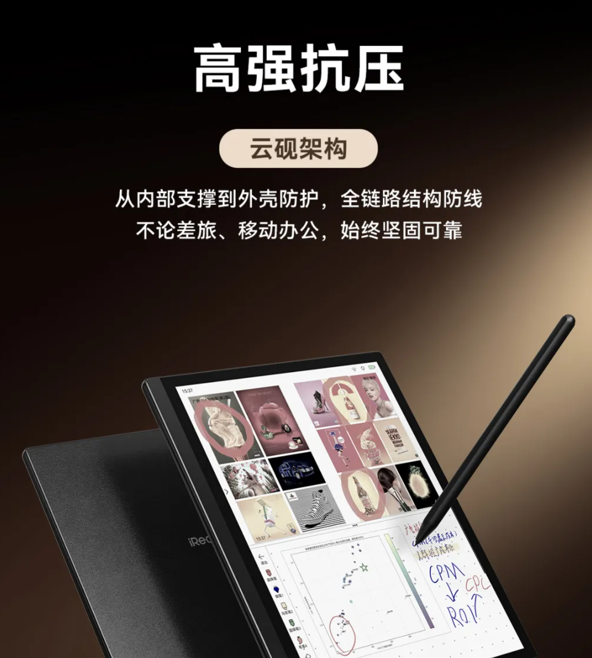 同时,该系列电纸书还带有云砚架构,配备高韧性内嵌高强骨架、高强抗弯钢化玻璃以及高阻抗干扰隔绝屏蔽舱,支持 AI 大模型智能办公,可一键生成会议纪要、文档摘要等。