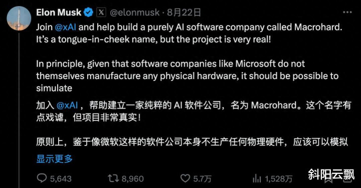 商业竞技的舞台上,马斯克再次展现了不按常理出牌的特质。2025 年 8 月初,他向美国专利商标局提交了 “巨硬”(Macrohard)商标申请,覆盖范围包括人工智能语音和文本生成软件、编写代码和设计视频游戏的人工智能工具,以及图像、视频和语言理解系统。