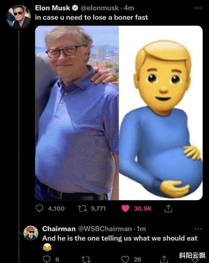 在个人层面,两人的交锋更是从商业分歧升级到了 “人身攻击”。马斯克曾在社交媒体上发布了一张比尔・盖茨挺着肚子的照片,并配文:“如果你想快速败性,我给你推荐这个(in case u need to lose a boner fast)。”