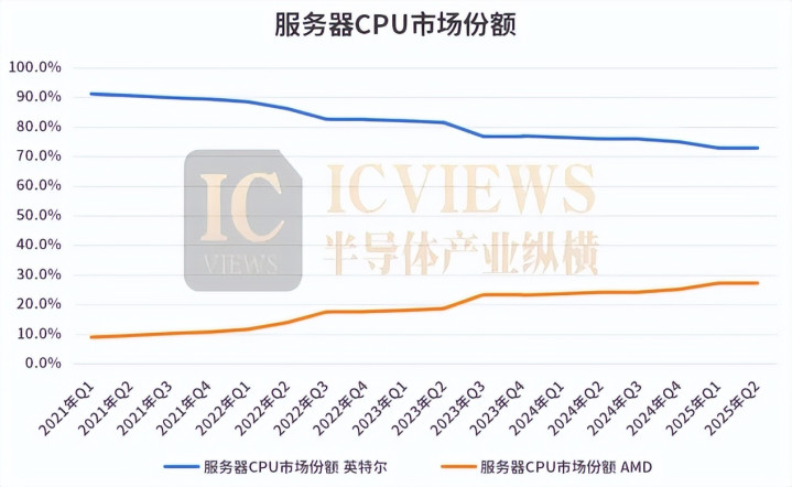 相比之下,由于最新的EPYC平台升级,AMD在2025年Q1实现了同比增长3.6%、环比增长2.1%的强劲增长。Q2,该公司的市场份额达到27.3%。