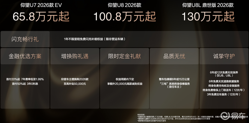 从价格来看,2026款仰望U7起售价65.8万元,U8起售价100.8万元,U8L鼎世版则定位130万元区间。