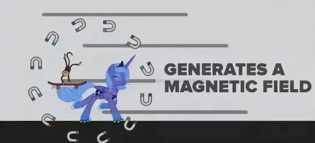 小马的背上,有一只猴子踩着滑板,以每秒5米的速度相对于小马向前运动。假设这只猴子带有电荷——我们知道,只有移动的电荷才能产生磁场,所以这只踩着滑板的带电猴子,必然会产生磁场。